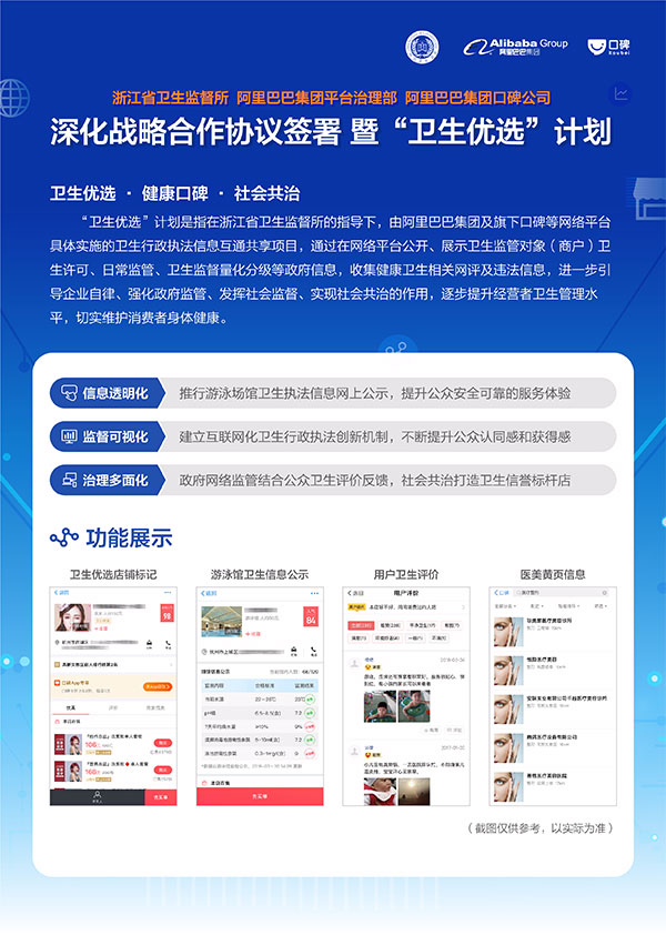 2018年4月18日,浙江省衛(wèi)生監(jiān)督所聯(lián)合本地生活服務(wù)平臺口碑,宣布啟動一項名為"衛(wèi)生優(yōu)選"的計劃?;谡l(wèi)生執(zhí)法信息的開放,給包含游泳館在內(nèi)的生活服務(wù)商家,衛(wèi)生狀況達標(biāo)的,他們的線上口碑店鋪打"衛(wèi)生優(yōu)選"標(biāo)簽,并予以重點推薦。